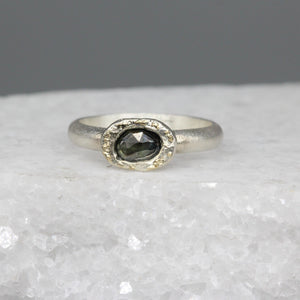 Blue Green Rose Cut Sapphire Ring in Sterling Silver with Gold Flecks