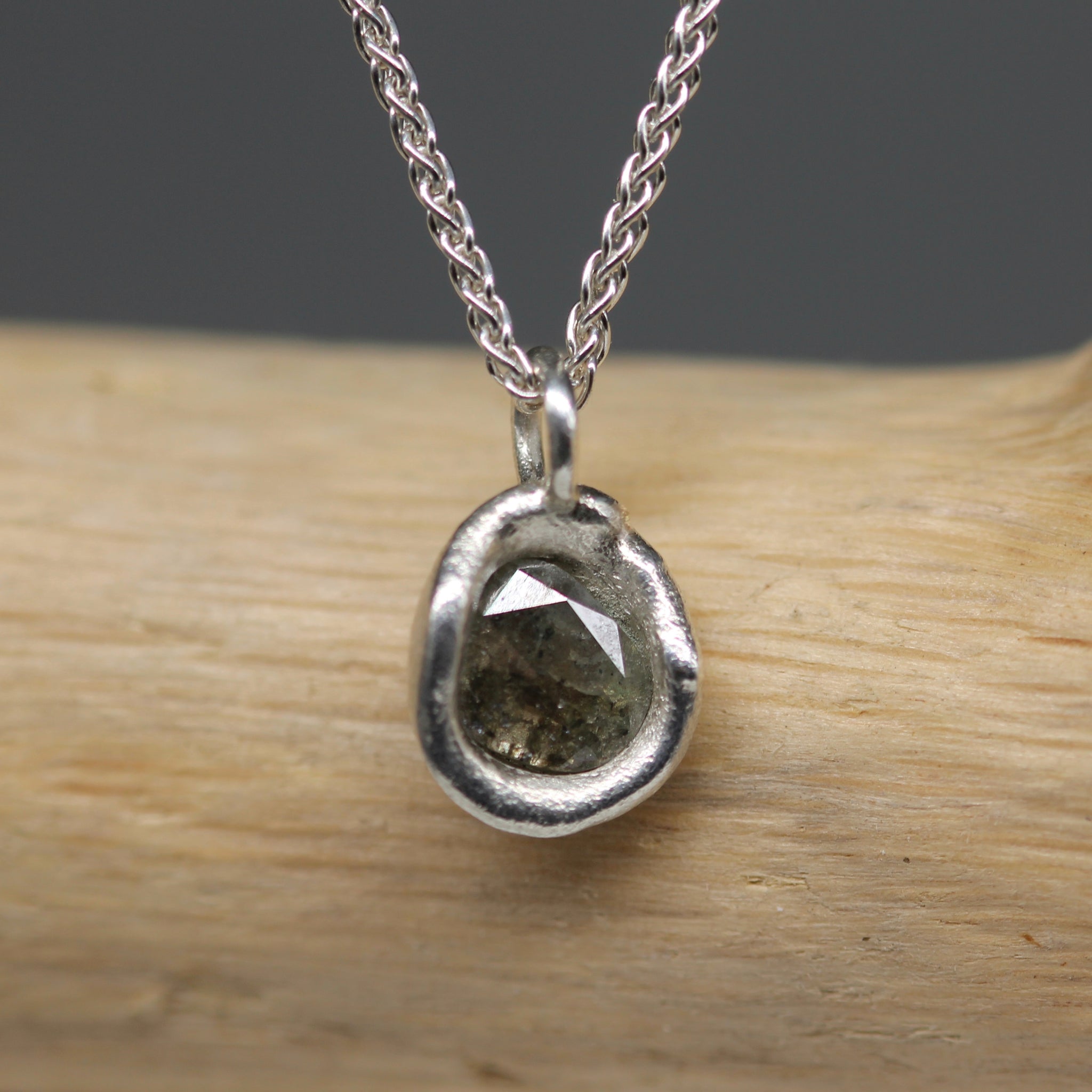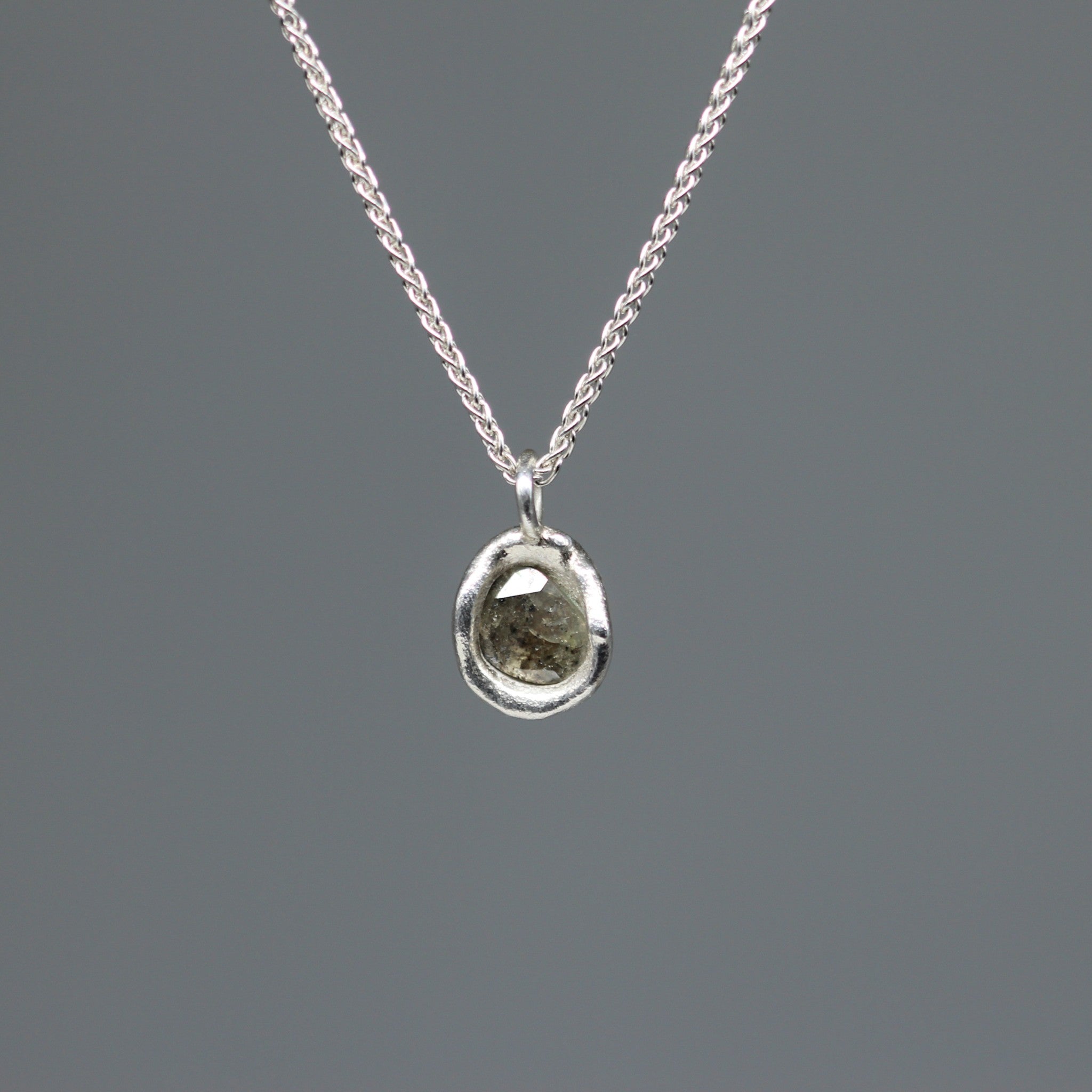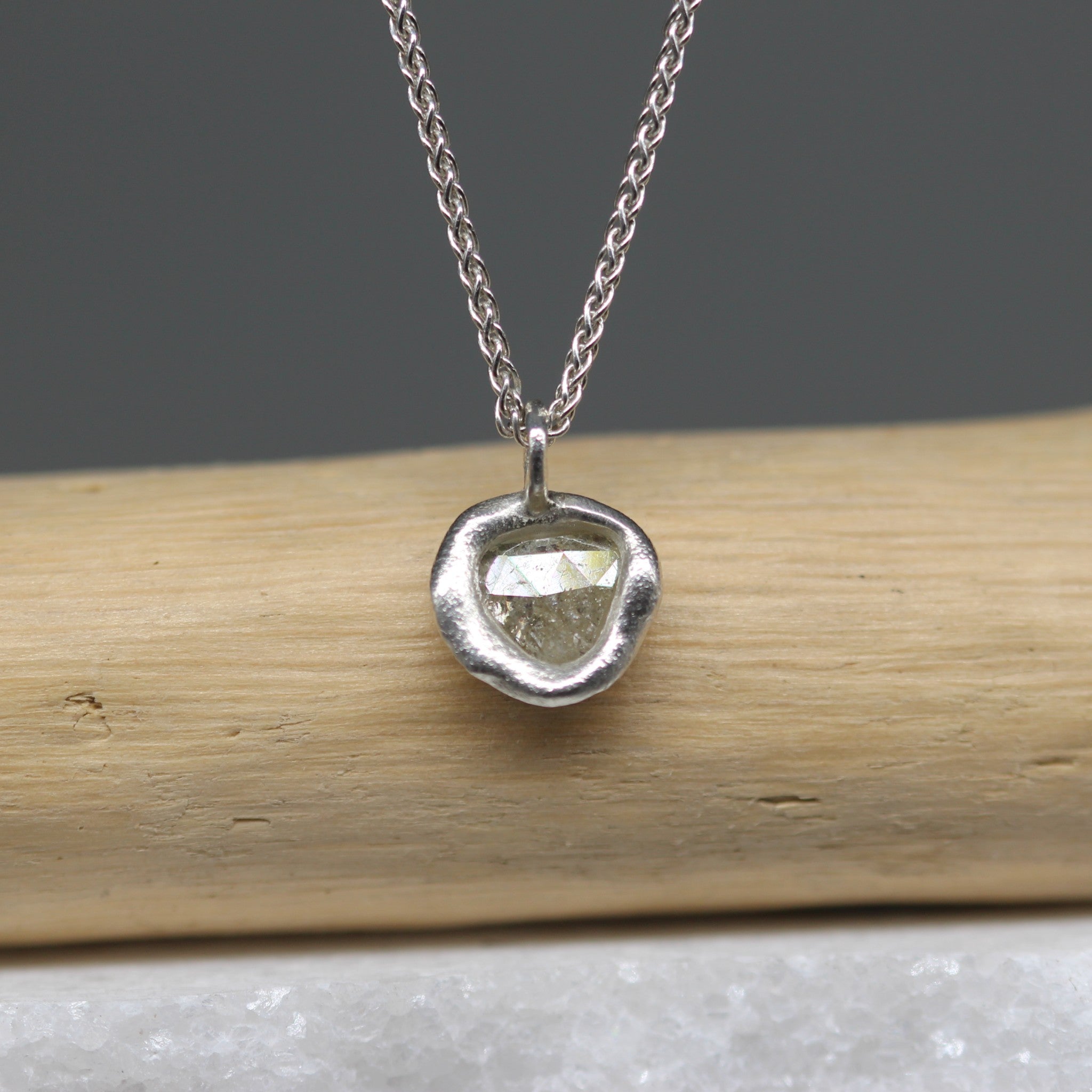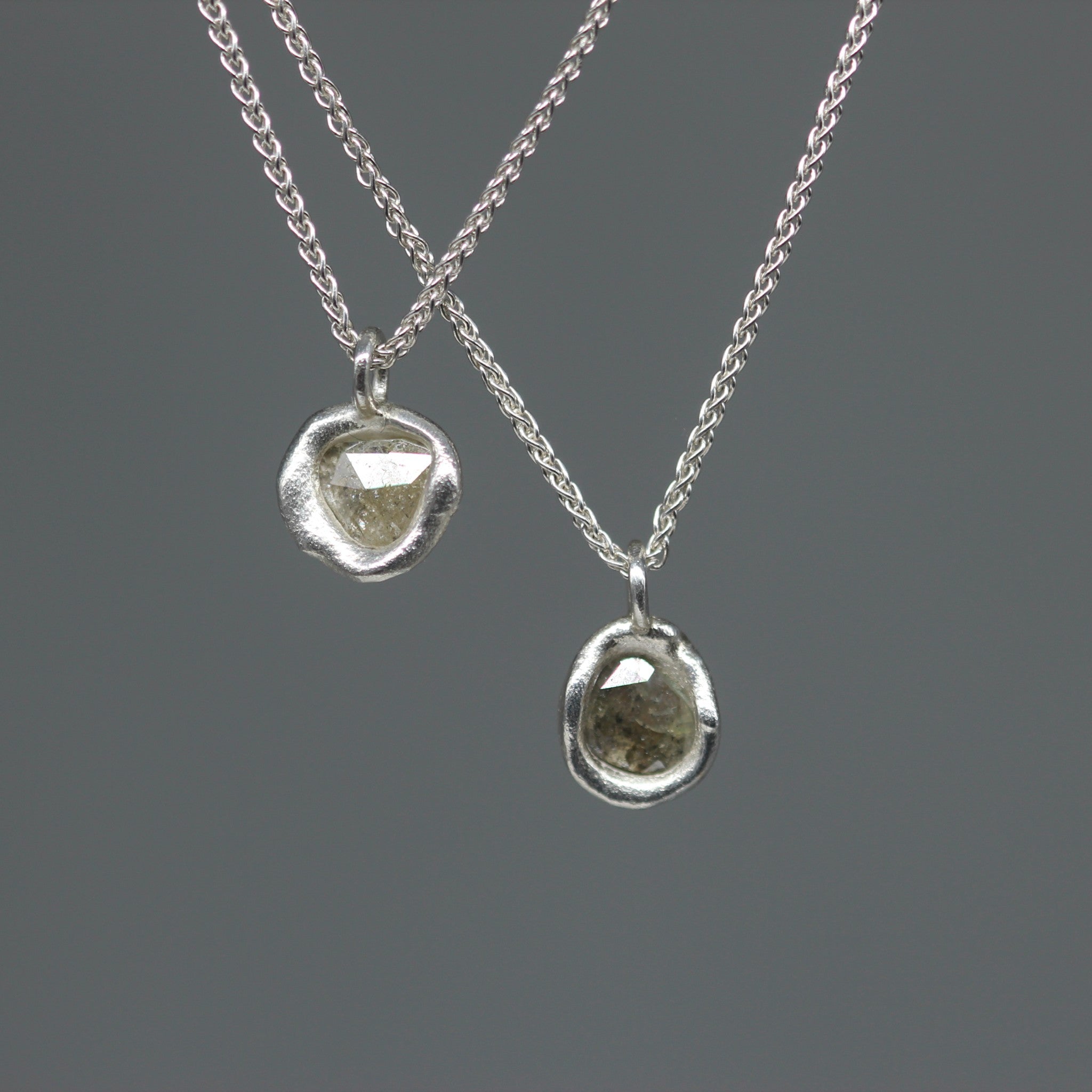 These molten-set rose cut diamond necklaces embody understated luxury with a touch of edge. Each pendant holds a one-carat rose cut diamond in a soft pale grey tone, its facets catching the light with discreet radiance. The stones are set in sculptural sterling silver, formed by hand in my signature molten style to give each pendant its own distinctive character.