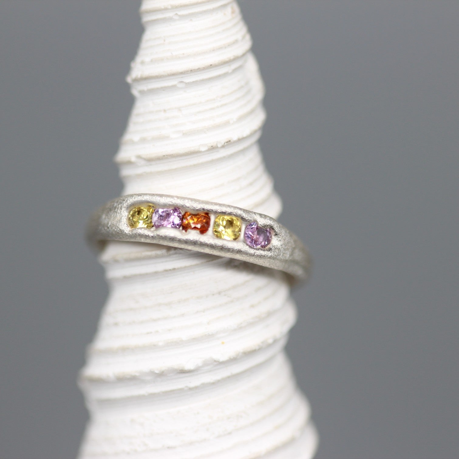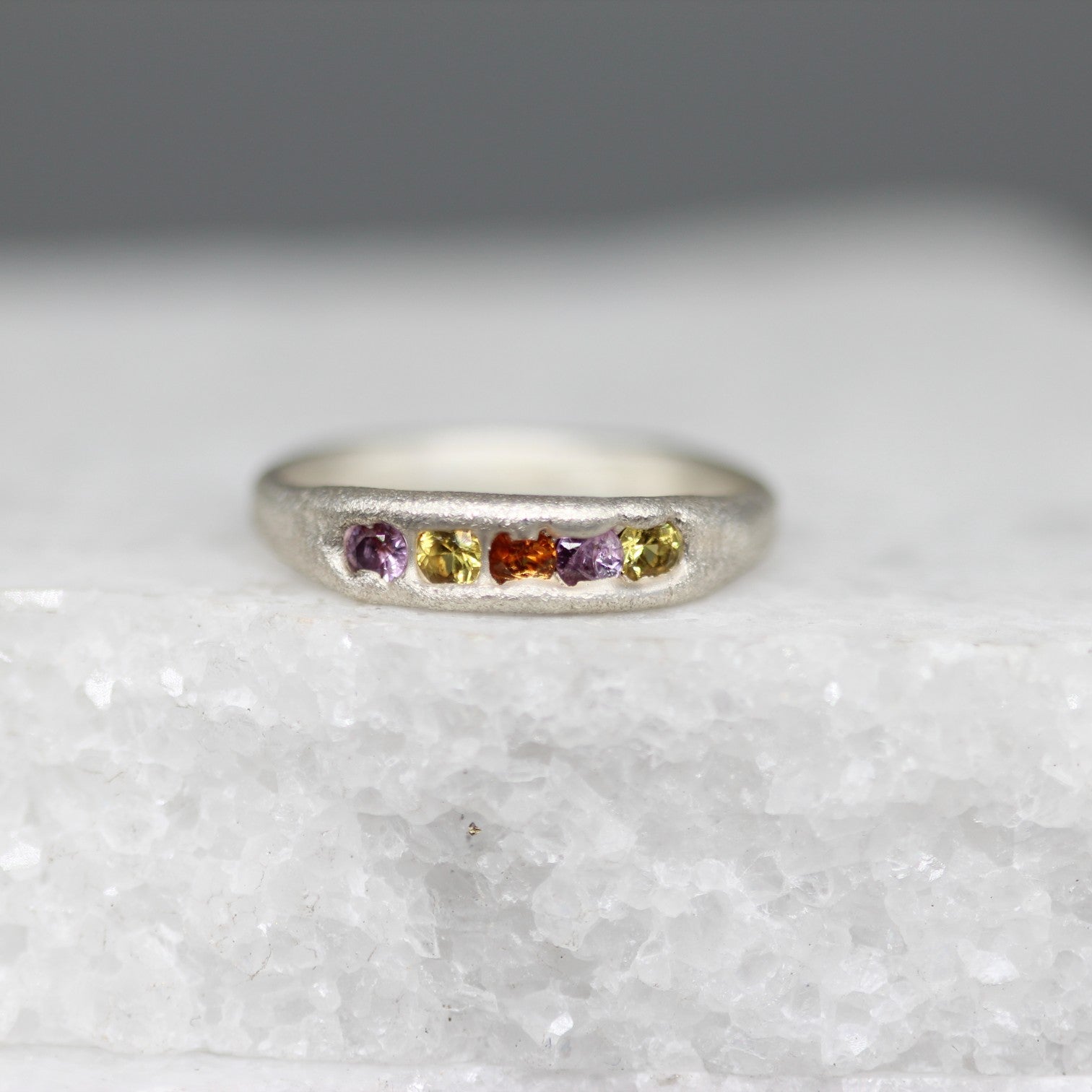 A glowing celebration of colour, this handcrafted half eternity ring is made in sterling silver and set with five vibrant sapphires in warm sunset tones. Each stone is carefully chosen and molten set into the softly textured band, giving a natural, organic finish that is both modern and timeless.