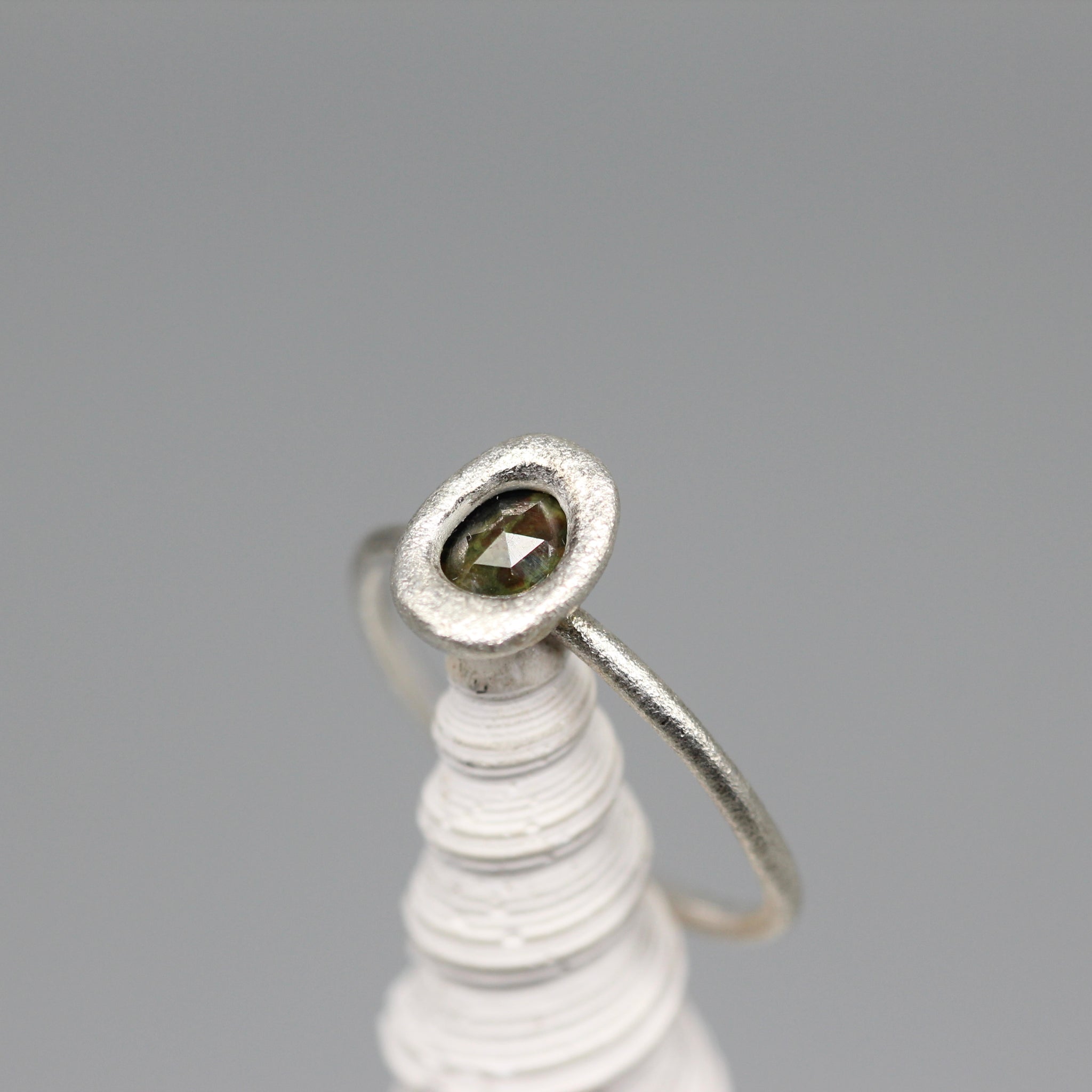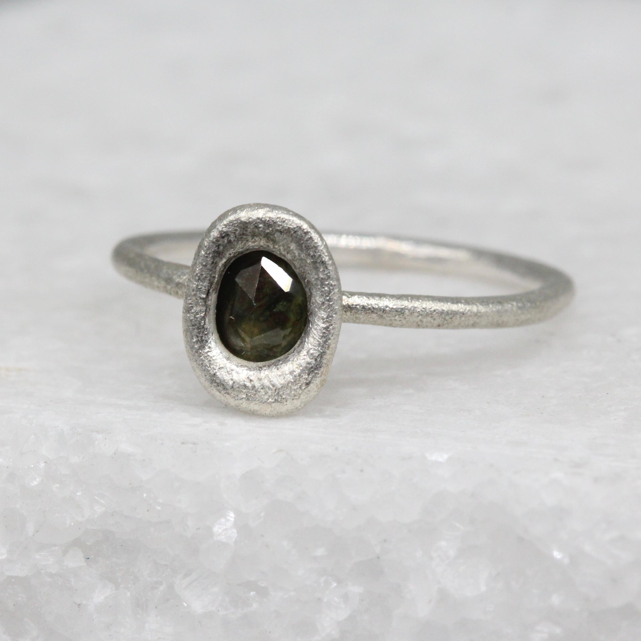 A simple yet striking stacking ring, handcrafted in sterling silver and set with a deep forest green sapphire. The stone is molten set within a softly sculpted bezel, giving it an organic and timeless feel.