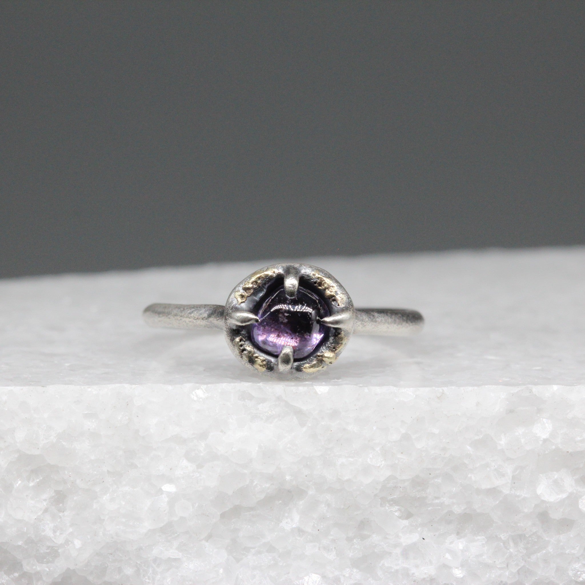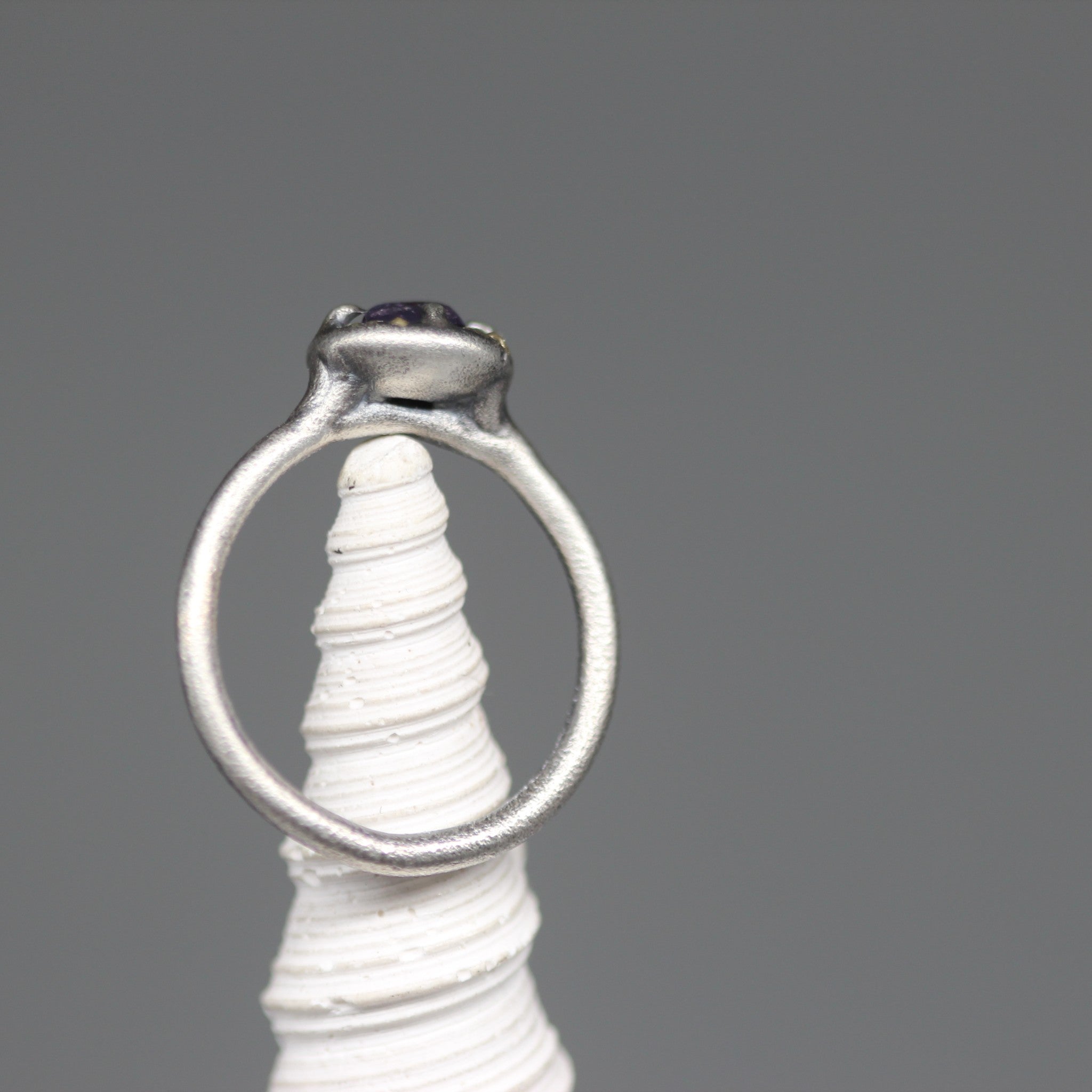 This ring balances ancient influence with modern refinement. At its centre is a polished purple sapphire, hand cut and polished in Sri Lanka, radiating a rich and vibrant tone. The sapphire is held within a sculptural sterling silver setting with tiny flecks of 18ct yellow gold, giving the piece warmth and a subtle sense of age.