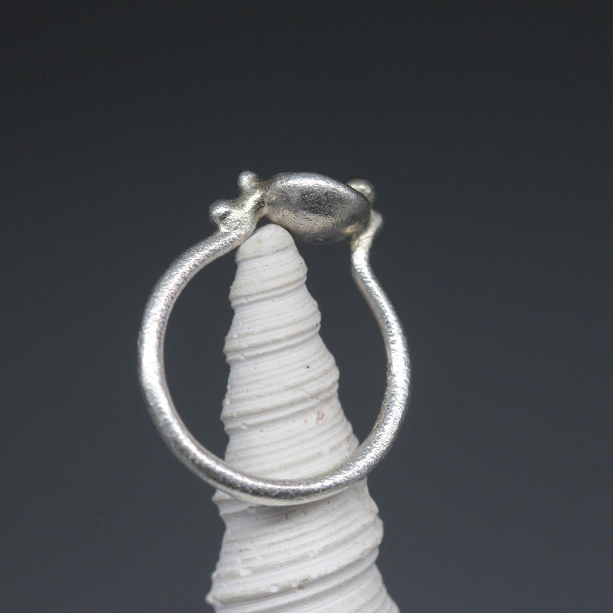 This ring captures the sculptural strength and refined stillness at the heart of my Modern Ancients aesthetic. At its centre sits a 1.2 carat rose cut diamond, its natural geometry and soft inclusions catching the light with a subtle, shifting brilliance. The diamond is held within a molten silver setting that flows seamlessly into a horseshoe-shaped shank, a distinctive detail that balances movement and form.