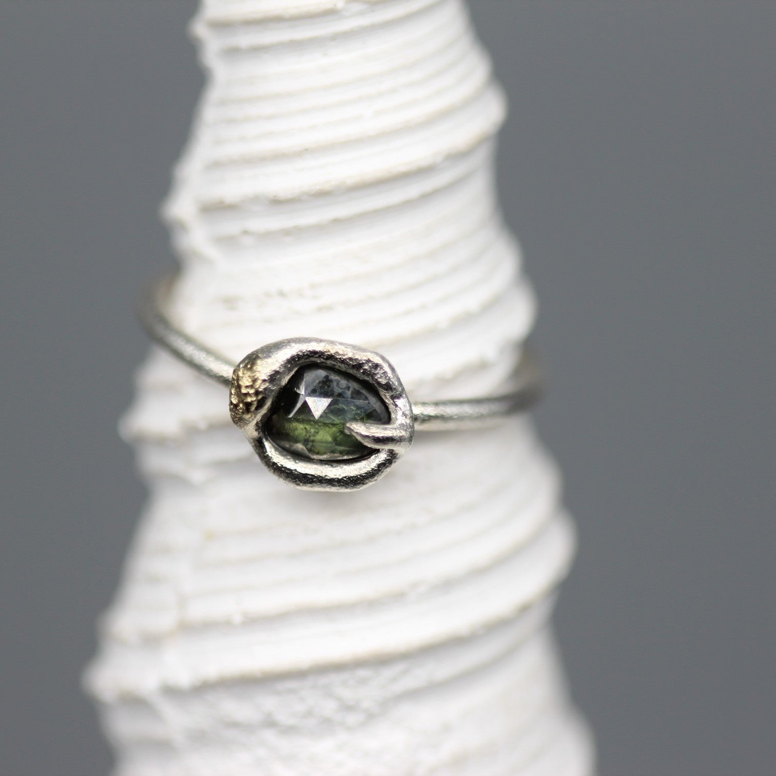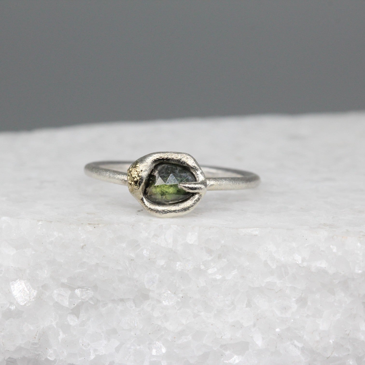 A unique sapphire ring handcrafted in sterling silver and set with a rose cut sapphire in deep green tones. The stone is molten set with a single sculptural claw and accented by a touch of 18ct yellow gold, giving the ring warmth and contrast.