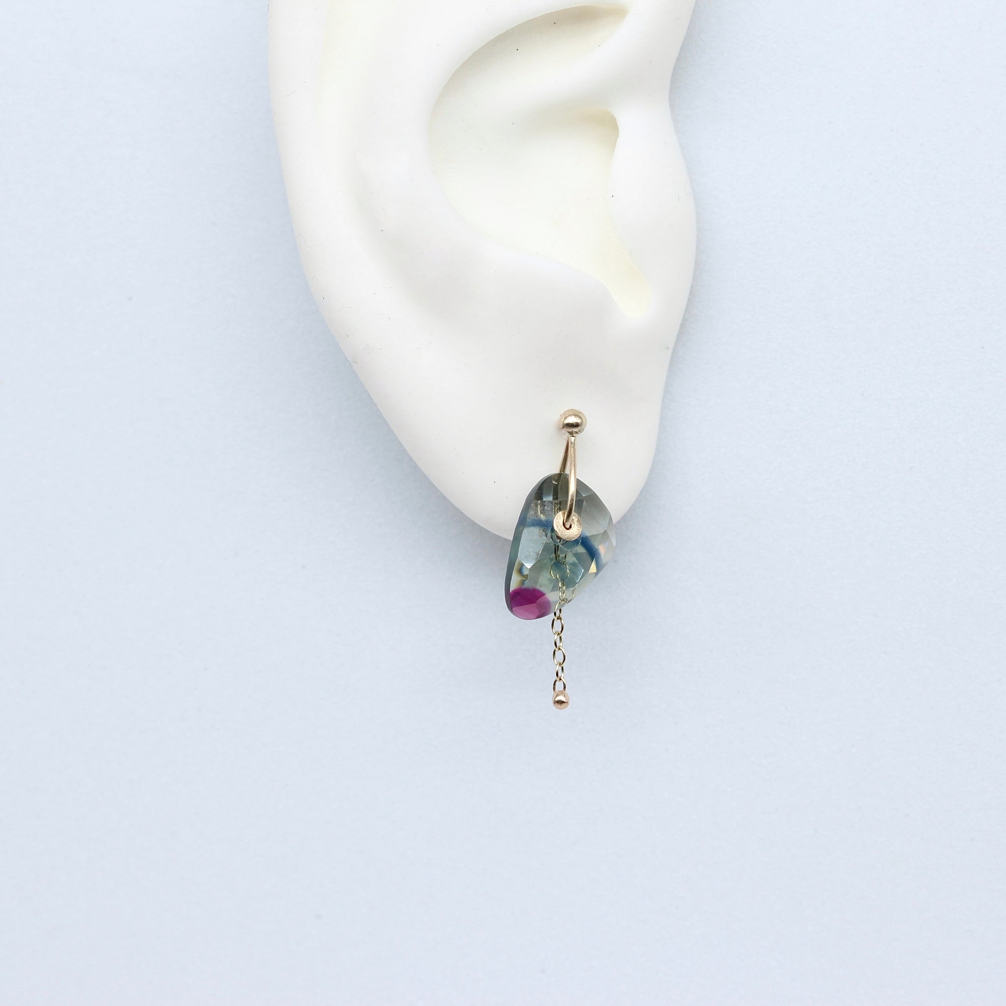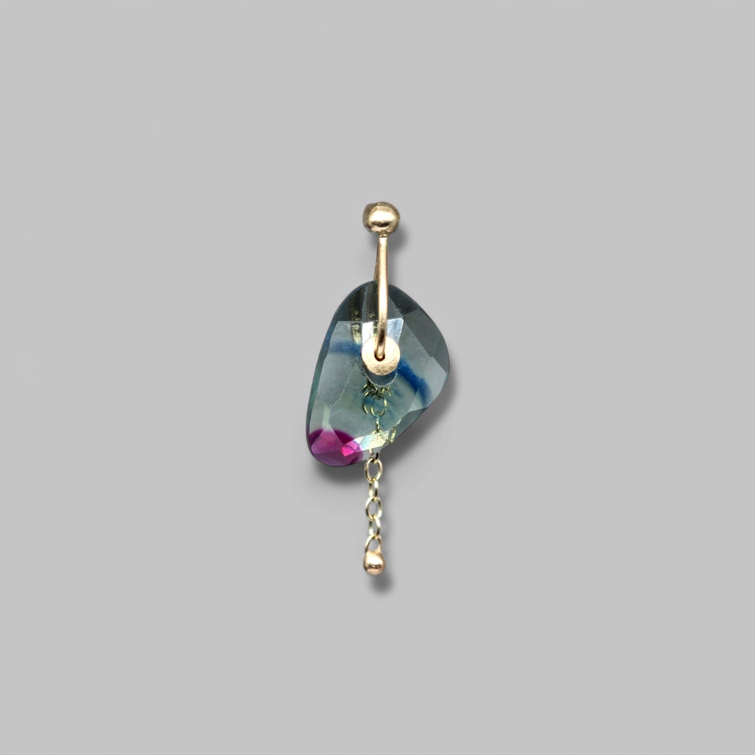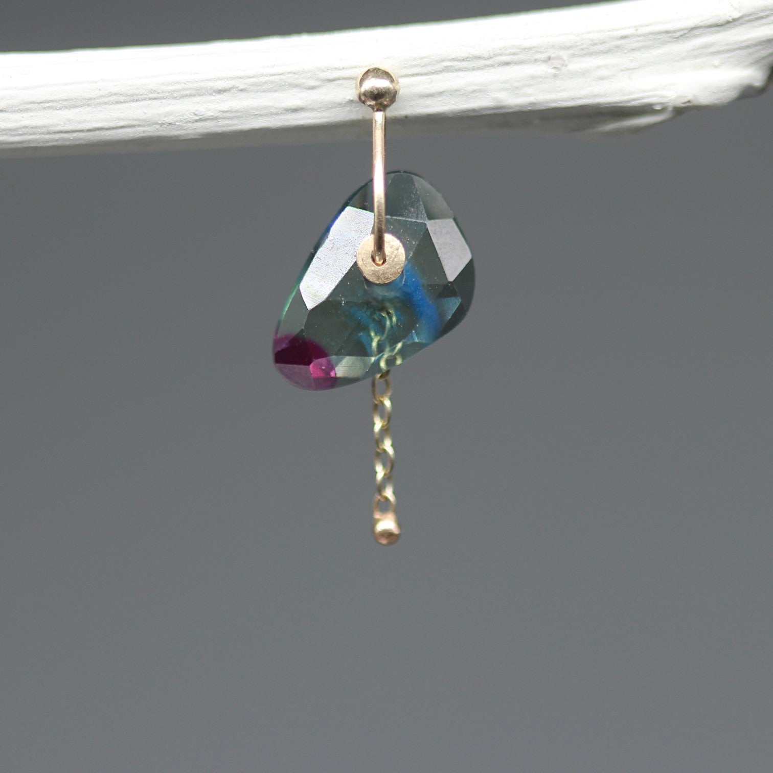 A striking one-of-a-kind single drop earring featuring a 2.81ct watercolour sapphire that shifts between deep blue and vivid pink. Hand-cut to reveal its painterly flashes of colour, this sculptural slice hangs from an elegant 9ct yellow gold sequin fitting with a soft, fluid drop.