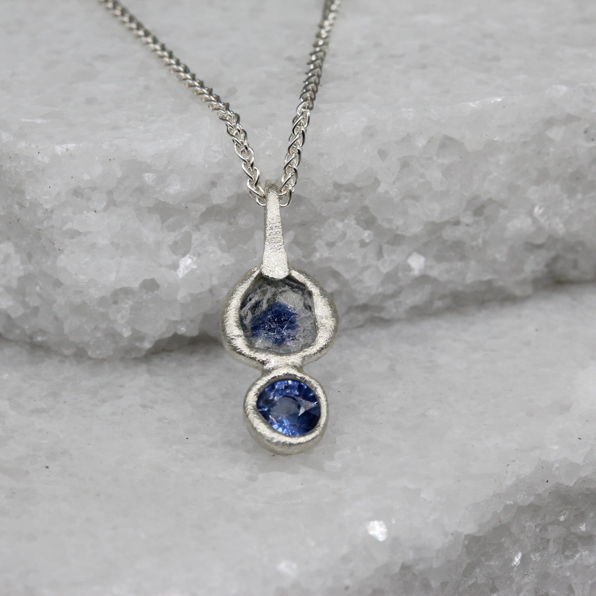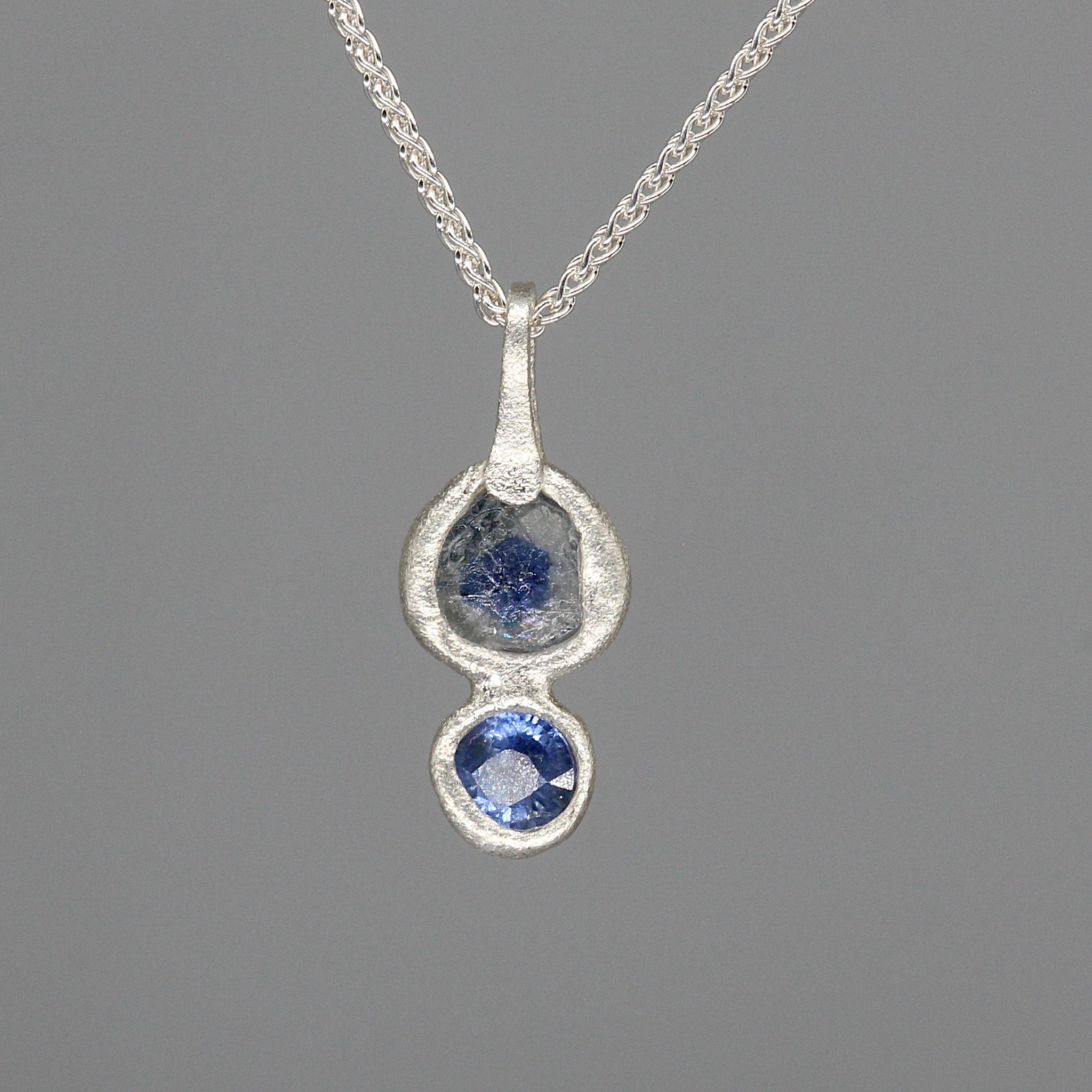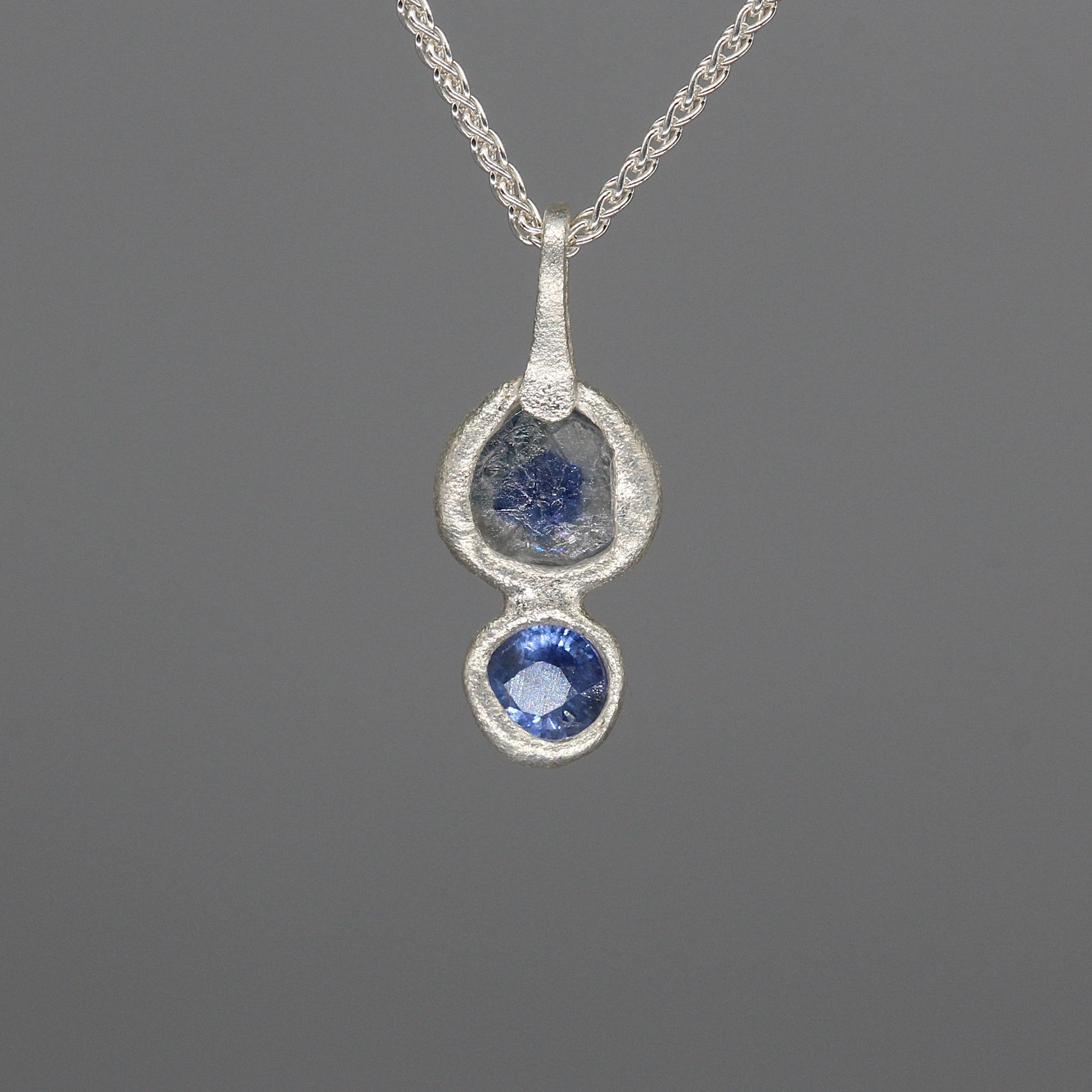 A sculptural pendant that pairs two sapphires in a molten set silver setting.