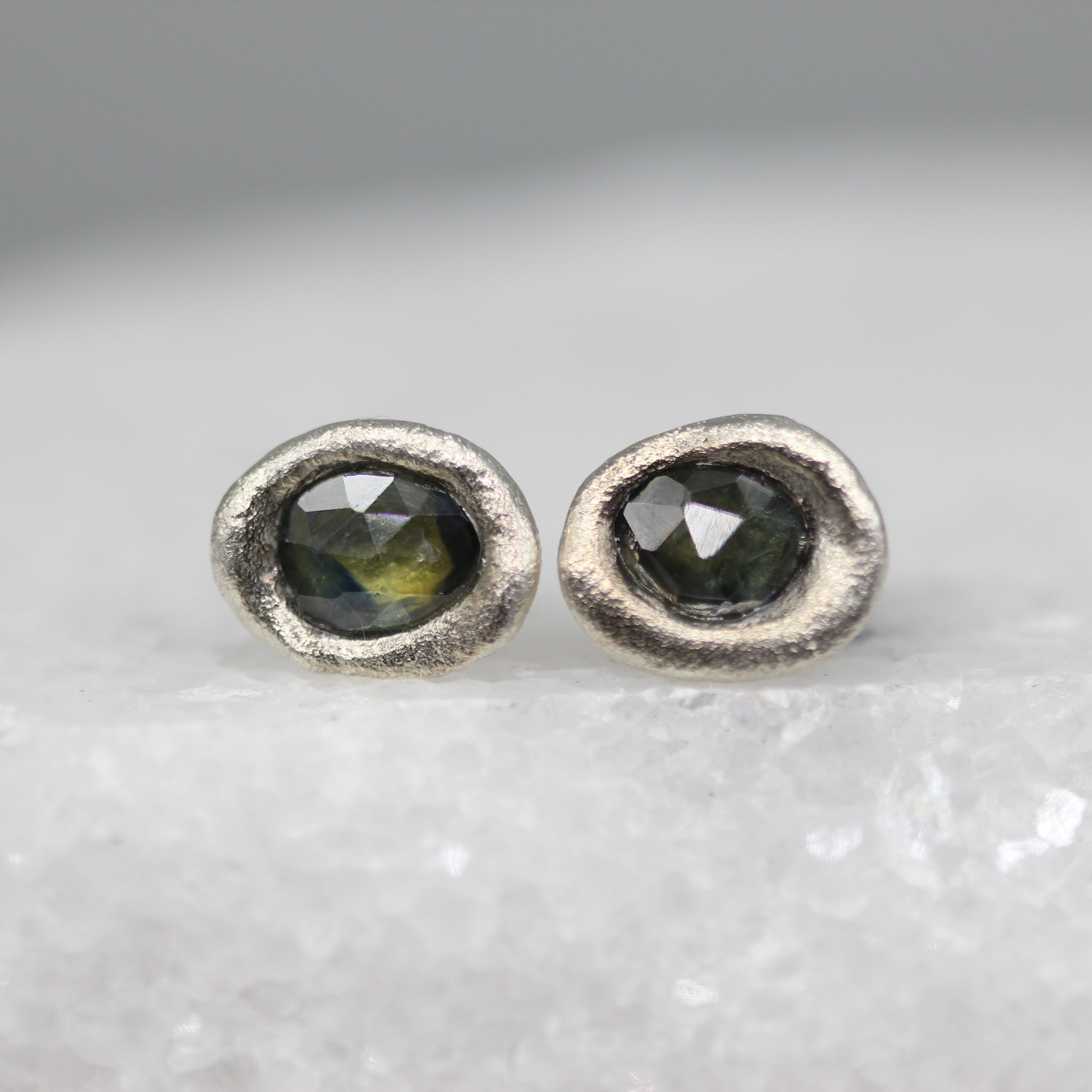 A sculptural pair of stud earrings, handcrafted in sterling silver and set with faceted green sapphires. Each stone is molten set into textured silver, giving the earrings an organic, one-of-a-kind character.