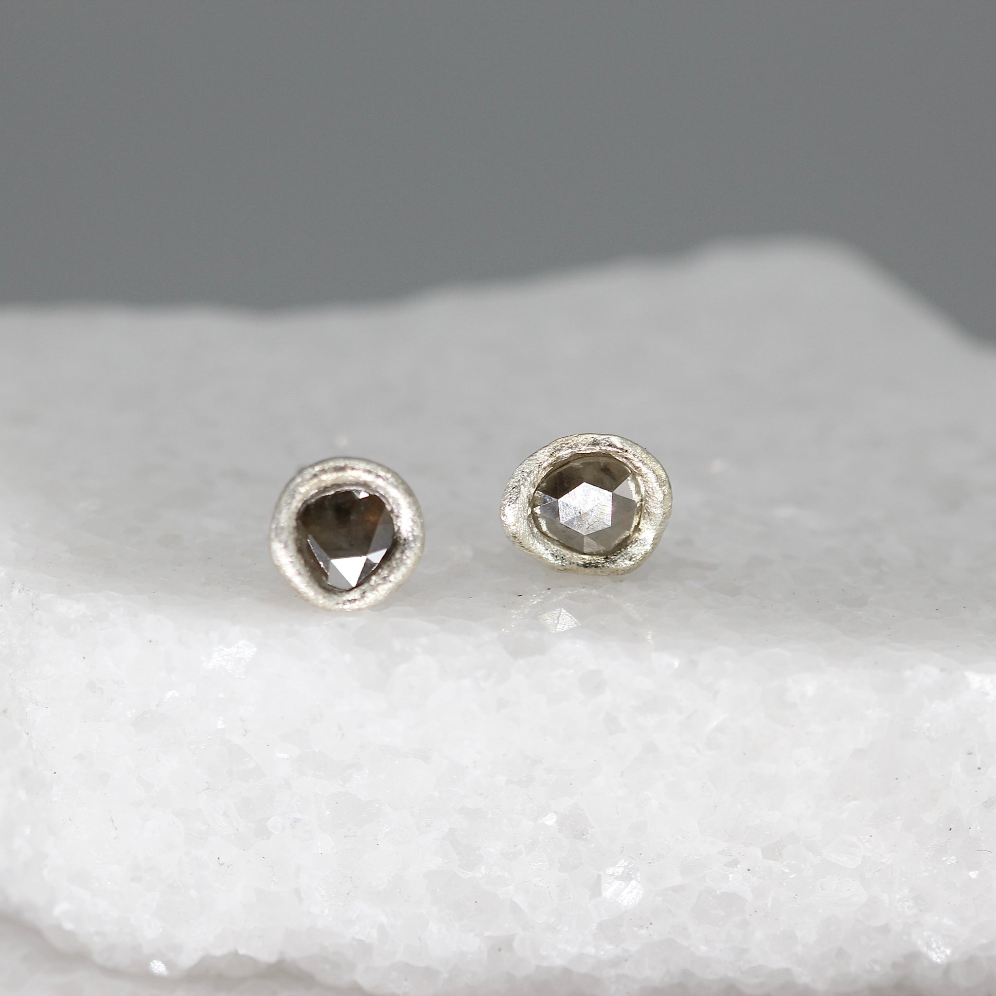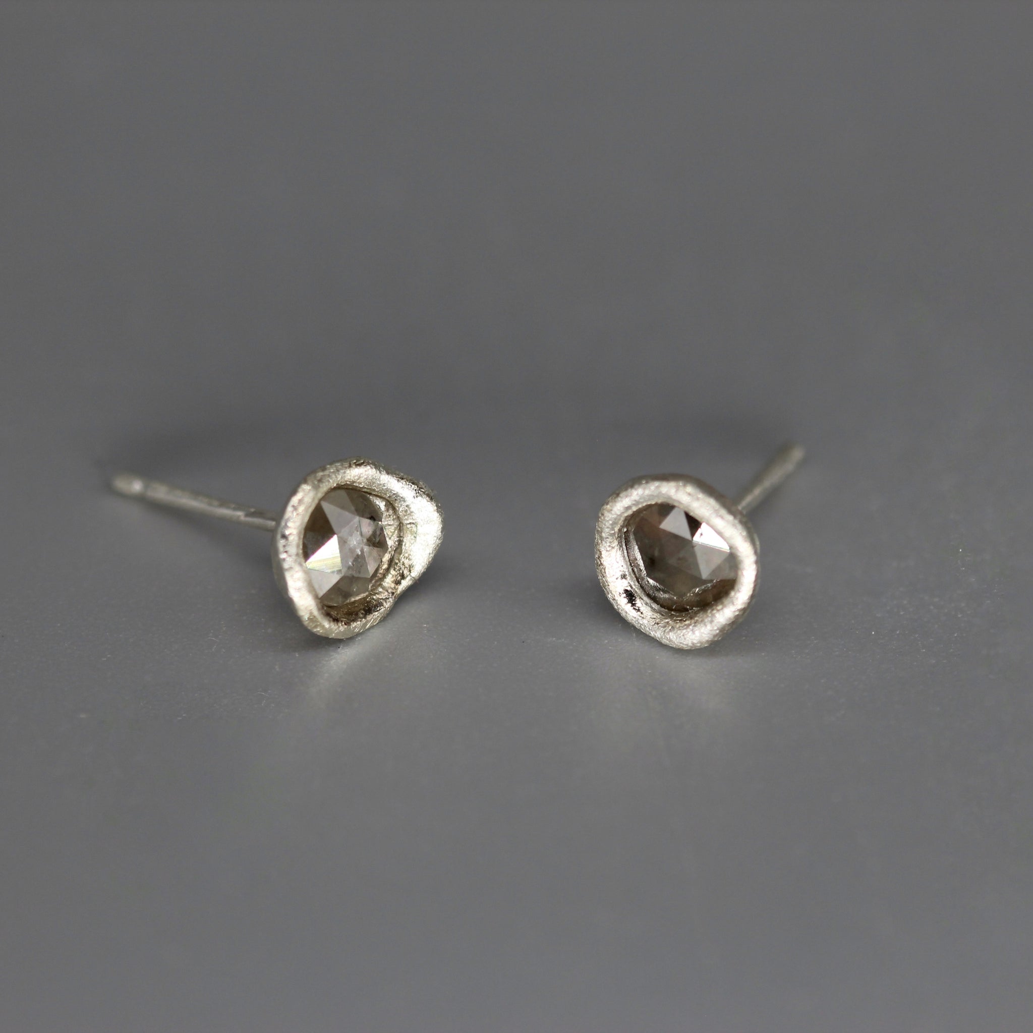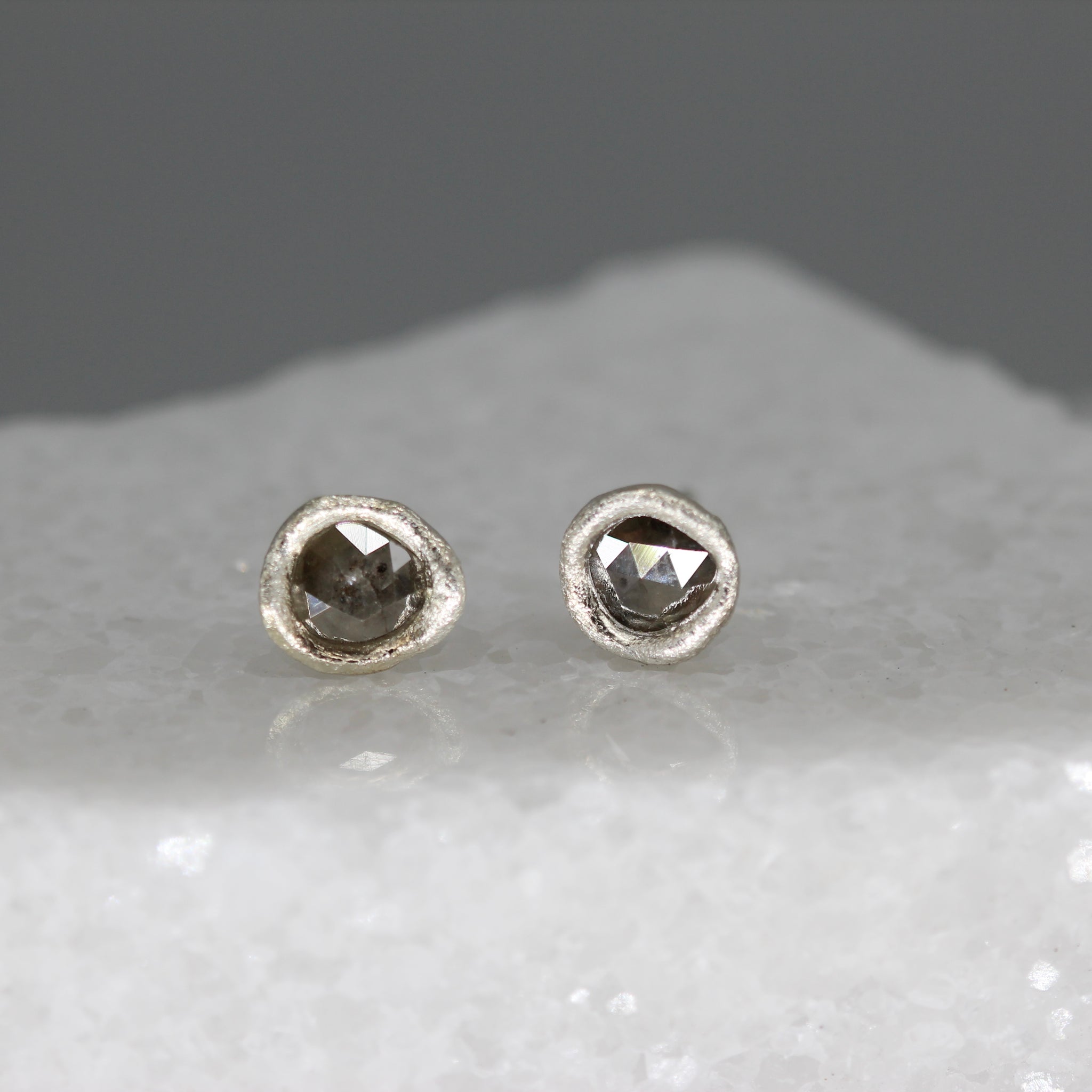 Using my signature molten setting technique, the silver flows around the stones with organic texture, making each earring subtly unique. The rose cut diamonds catch the light with their mirror-like facets, giving off a soft and timeless sparkle.